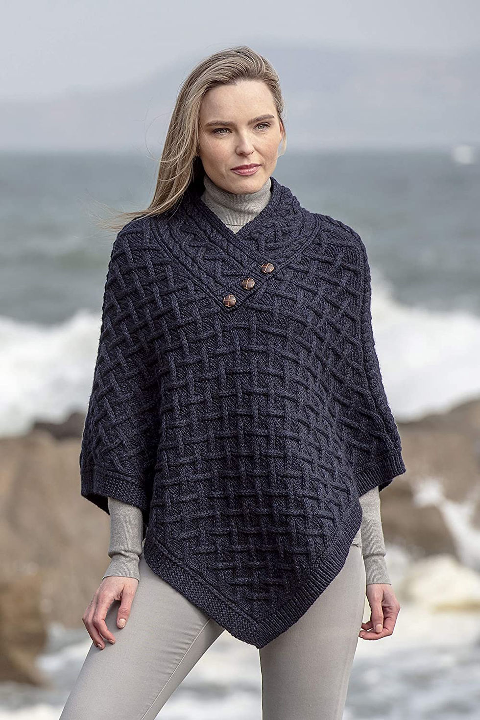 Aran Crafts Women's Cable Knit Nua Button Poncho (100% Super Soft Merino Wool)
