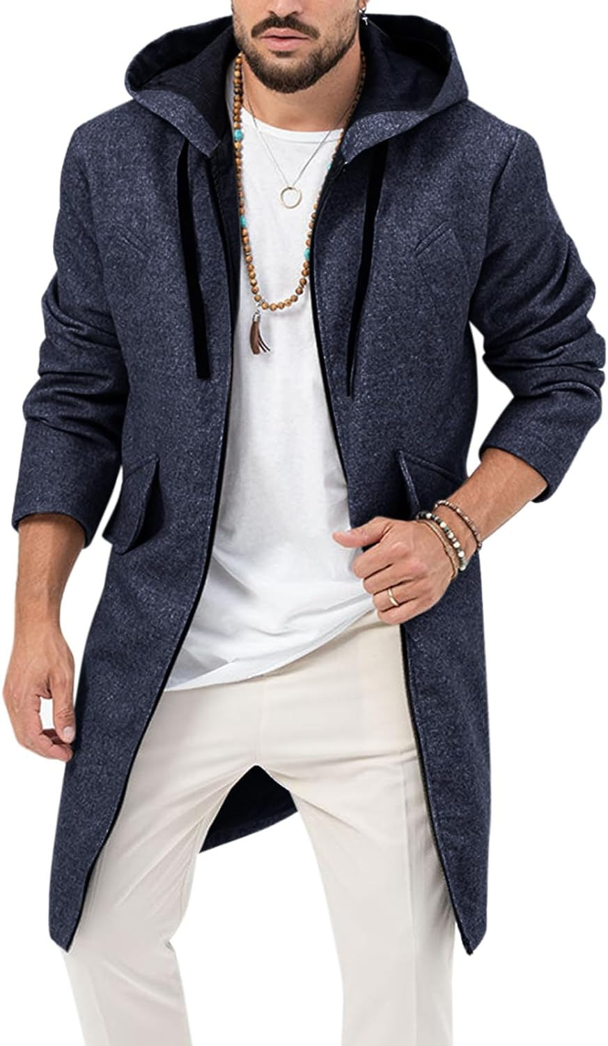 ZIWOCH Mens Trench Coat Wool Blend Hoodie Long Jacket Full Zip Winter Classic B